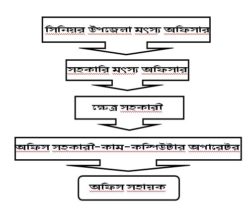মহাপরিচালক → অতিরিক্ত মহাপরিচালক → পরিচালক/প্রধান বৈজ্ঞানিক কর্মকর্তা → উপপরিচালক/অধ্যক্ষ → জেলা মৎস্য অফিসার/সিনিয়র সহকারী পরিচালক → সিনিয়র উপজেলা মৎস্য অফিসার/সহকারী পরিচালক → উপজেলা মৎস্য অফিসার → সহকারী মৎস্য অফিসার → ক্ষেত্রসহকারী/অফিস সহকারী কাম কম্পিউটার অপারেটর → অফিস সহায়ক